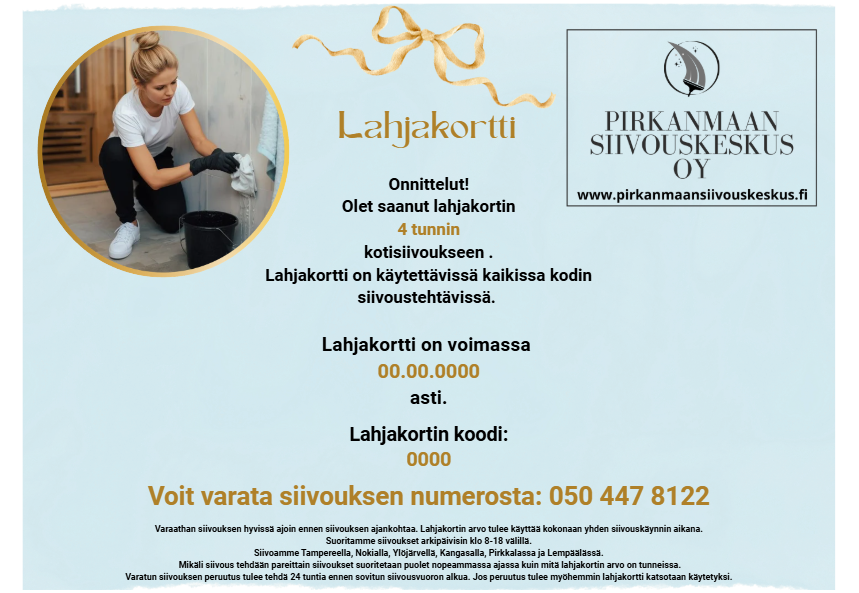 Lahjakorttimme on helppo hankkia ja käyttää – juuri sitä, mitä kiireinen elämä kaipaa: käytännön apua ja huolenpitoa arjen sujuvuudesta. Yllätä läheisesi tai henkilöstösi ja anna heille mahdollisuus nauttia puhtaasta, raikkaasta ympäristöstä!